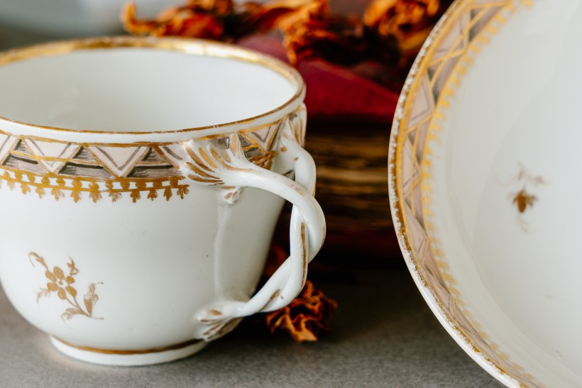 不過,杯底與盤底的兩組刻凹數字,可以讓我們更為精確地確定生產時間。維也納窯廠從1783年底開始使用刻凹數字表示製作年代,至1799年,以84-99來表示十八世紀的製作年代。這客瓷杯的杯與盤,分別有78與87兩個數字,本應表示1778與1787兩個年份,但因為1783年底,才開始刻數字標示年代,1778這個選項,便不可能,而且,杯盤的描繪風格一致,不像相差將近十年的產物,可以推斷,78可能是刻製時的手誤。從這數字,便知道這客瓷杯是在1787年製造的。至於另外一組數字(25/ 24),則是代表當時拉胚師傅的編號。