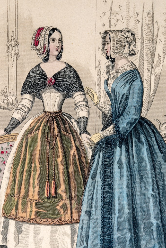 1840-1850年代,衣著打扮反映出當時的社會風尚。為了維持鐘形裙子的形狀,女士必須在裙下穿著襯裙,上半身則是緊身上衣。上衣順著身體往下,一路到腰線下以V字尖端作結束。此時,腰部成為視覺焦點,女士們靠著馬甲內衣將腰部勒緊至不盈一握的柳腰。