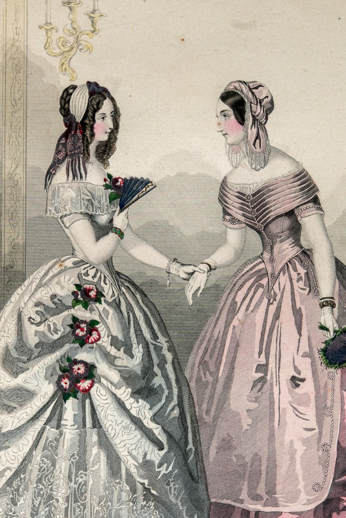 1840-1850年代,衣著打扮反映出當時的社會風尚。為了維持鐘形裙子的形狀,女士必須在裙下穿著襯裙,上半身則是緊身上衣。上衣順著身體往下,一路到腰線下以V字尖端作結束。此時,腰部成為視覺焦點,女士們靠著馬甲內衣將腰部勒緊至不盈一握的柳腰。