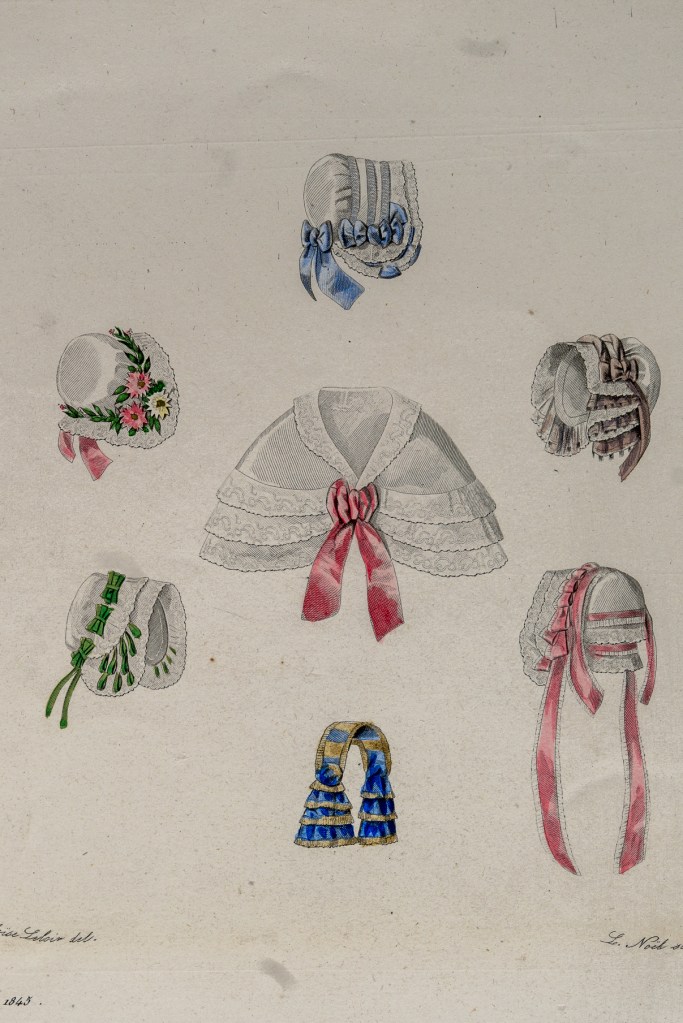 晚宴時,穿著的衣服常常是露肩的。因而,在室內亦流行蕾絲披肩,室外則穿戴帽子。這時的頭飾倒是比衣服變化多端,小型罩帽、騎師帽、包頭巾都很受歡迎。1830年代後期、40年代最受歡迎的是寬緣罩帽,寬到穿戴者側身站立時,完全遮住臉龐。