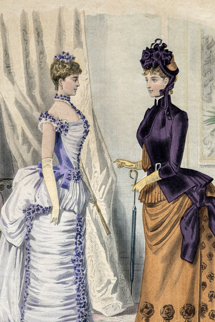 1871-1880年代,流行重點在裙子的背面。拉長緊身的上衣,低的方形領很受歡迎,腰線比1860年代低。裙子前面是平整的,後面的長拖裙上覆蓋了大量的皺褶、褶邊、花邊、褶飾,是流行的重點。而巴斯爾裙襯(bustle)對此一趨勢,有相當的影響。