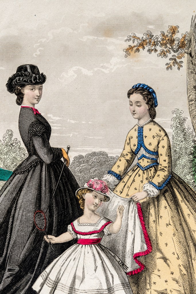 1861-1870年代,女性衣服著重在合身、高領的上半身,較低的肩線有著寬袖子,領口與袖子部分有可拆卸清洗的白色蕾絲裝飾,裙子仍維持著鐘形外貌。60年代晚期,裙子後部逐漸被強調出來,成為整件衣物的重點,靠著臀墊的裝置,到了1870年代女裝有了較高聳,但還算柔順的臀部曲線。