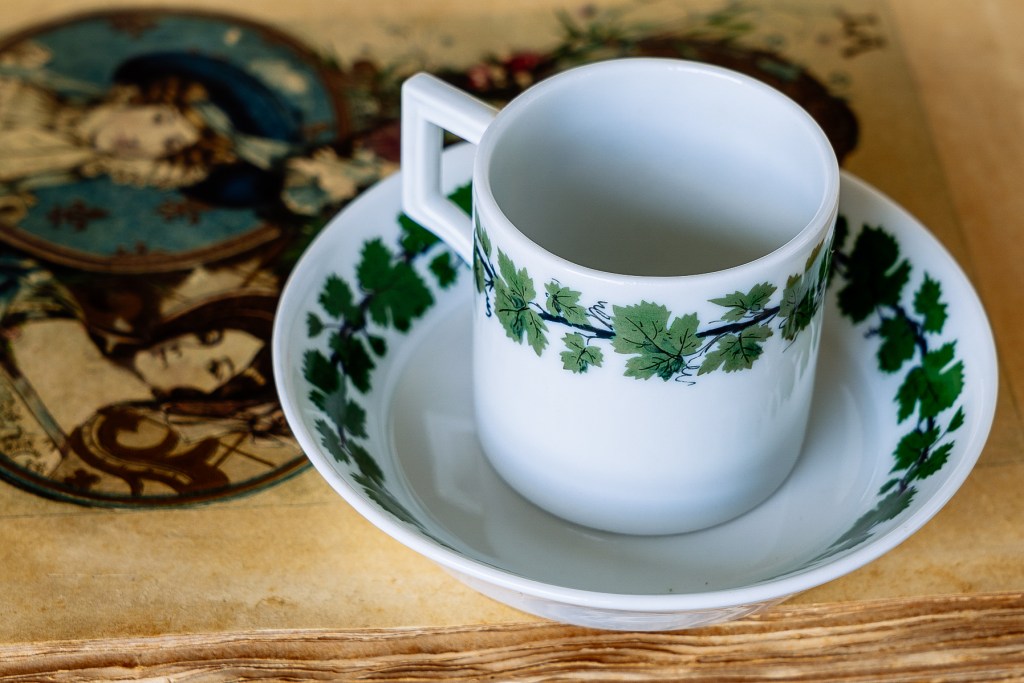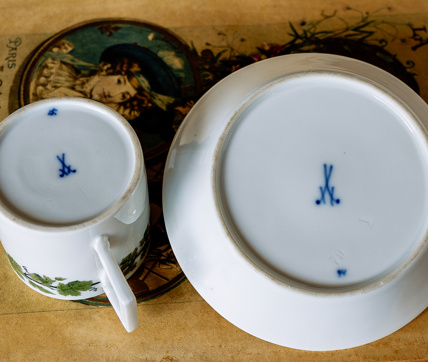 這客德國麥森窯的濃縮咖啡杯,帶著我們進入到另一個品嚐咖啡的新世代。從這客瓷杯的底部落款來看,約是1815年到1923年麥森窯慣用的落款。在他們特有的釉下藍色交叉雙劍底部,這個時期多出了兩個突出的圓點,代表著劍柄。在這長達一百多年的時間中,我們還是可以為為這客杯子訂出個比較短的斷代。杯子的造型是麥森窯18世紀末的新古典造型,從杯把的設計可以看出那個時代的影響,也因此被稱為柏林款,正因普魯士王國當時首府所在的柏林引領著德意志民族新古典的路徑。1814年,麥森有了新的總監,引進新的技法,開發出釉下綠彩,德國藝術家阿爾諾德(Johann Samuel Arnold, 1766-1828)設計出至今仍為麥森使用的綠色葡萄藤蔓圖案,也是我們這客瓷杯的圖案。