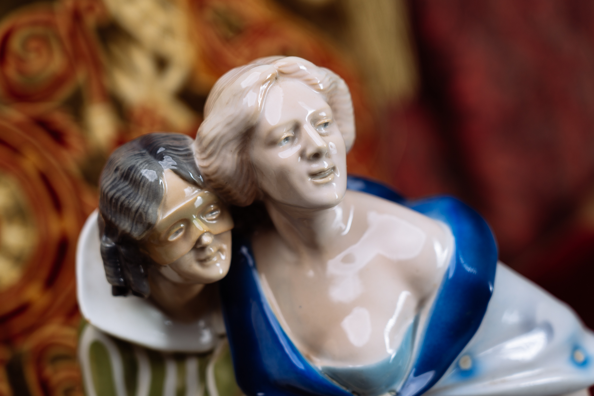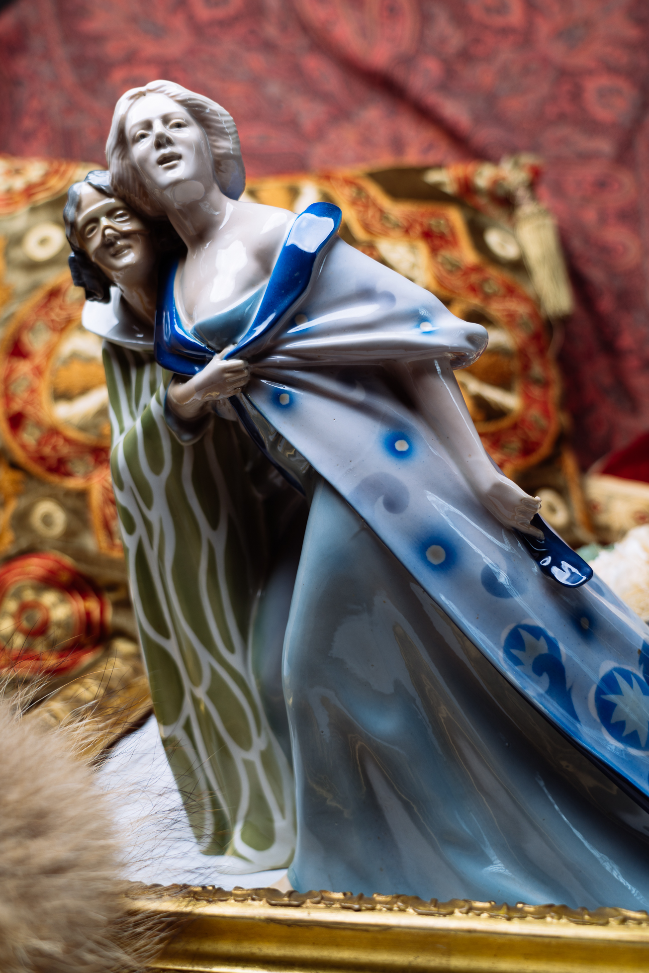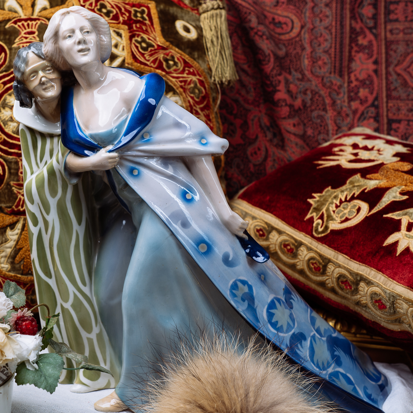 這尊瓷偶品相精美,為典型德國新藝術風格。一名仕女卸下面具,在侍女的攙扶下離開嘉年華會會場,接近三角的造型,動態表現十足。仕女左手拉住長袍,抬首翹望,彷彿在看盛會最後的煙火一般。小侍女緊貼著主人,一方面攙扶主人,一方面也順著女主人的目光,看著讓她依依不捨的場景。侍女水波般的衣飾圖案與仕女藍色的毛絨大衣,搭配人物的造型設計,是尊少見的特殊瓷偶。