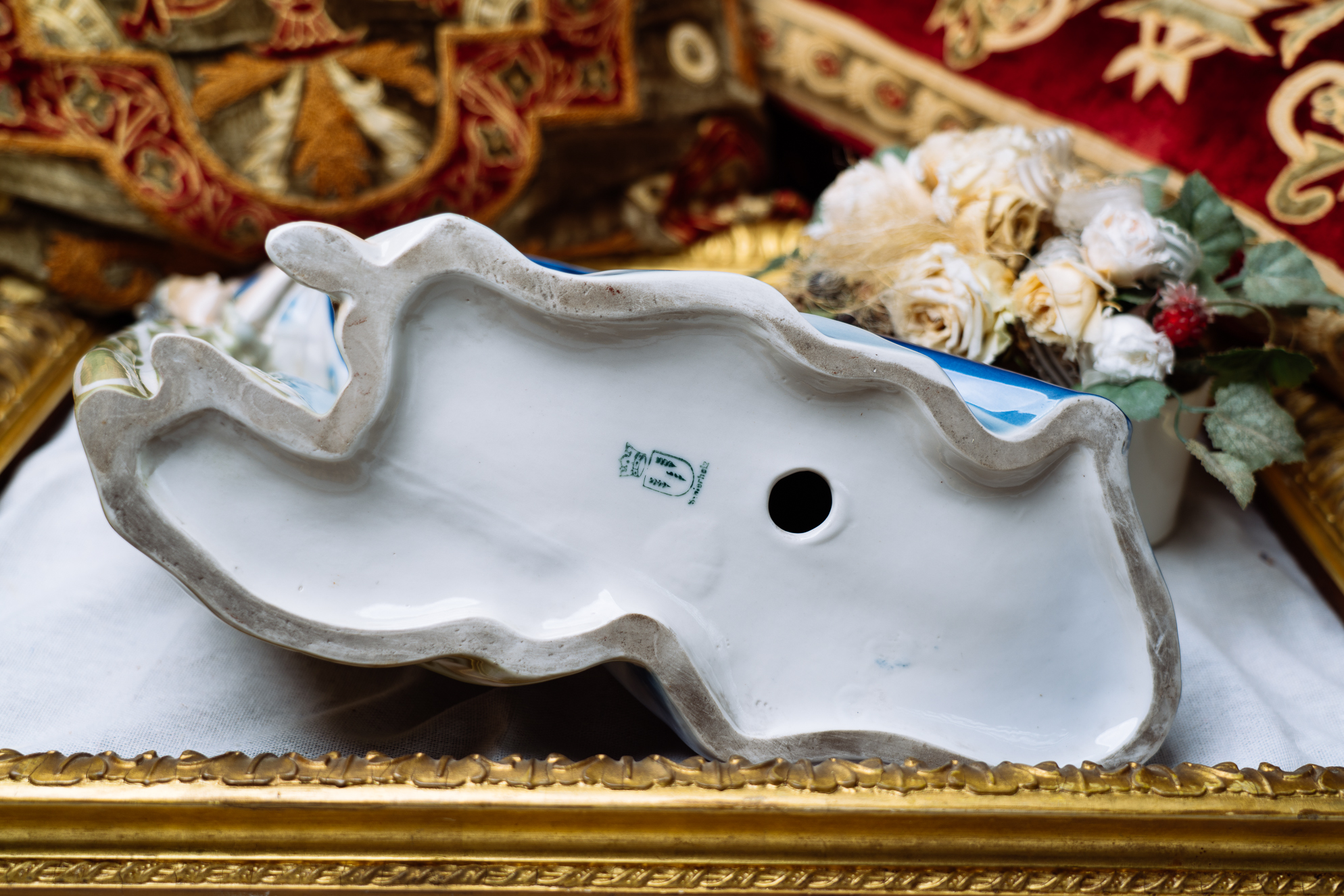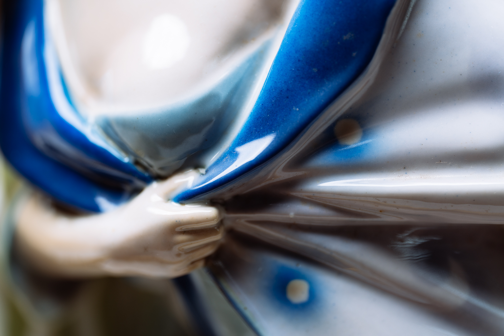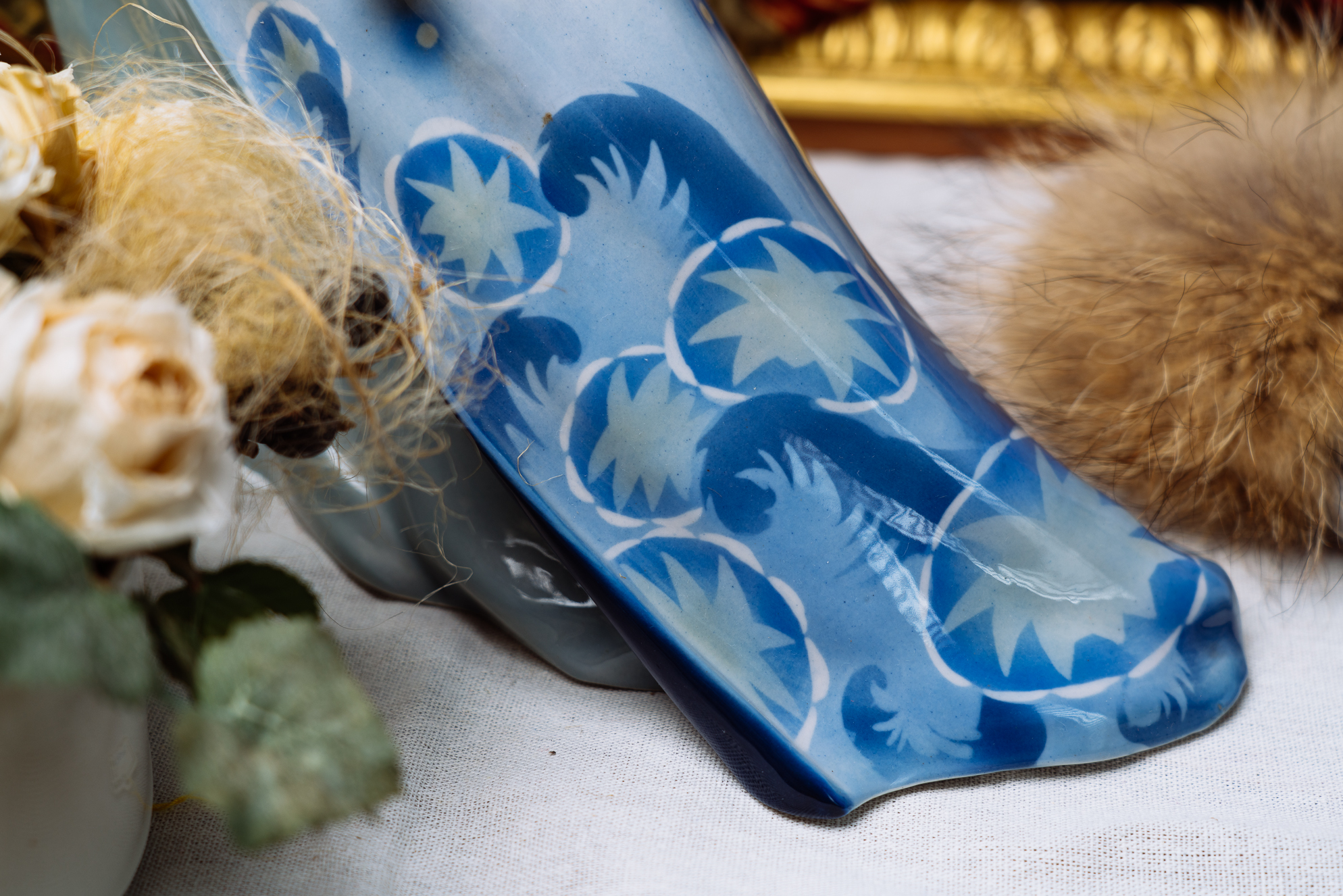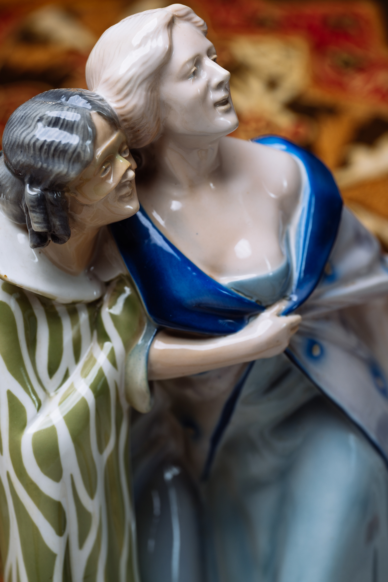 這尊瓷偶品相精美,為典型德國新藝術風格。一名仕女卸下面具,在侍女的攙扶下離開嘉年華會會場,接近三角的造型,動態表現十足。仕女左手拉住長袍,抬首翹望,彷彿在看盛會最後的煙火一般。小侍女緊貼著主人,一方面攙扶主人,一方面也順著女主人的目光,看著讓她依依不捨的場景。侍女水波般的衣飾圖案與仕女藍色的毛絨大衣,搭配人物的造型設計,是尊少見的特殊瓷偶。