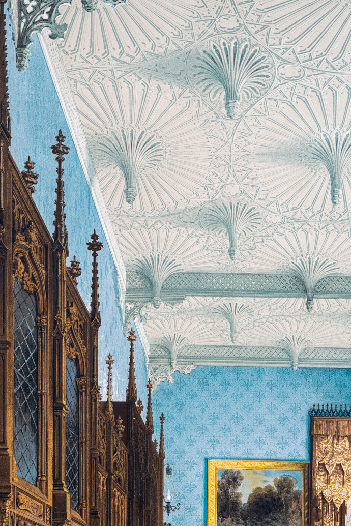 這張彩色石版,出自【巴伯斯貝格堡:十二幅水彩】圖冊,紀錄了巴伯斯貝格堡(Schloss Babelsberg)的內外景緻。這座城堡建於1833-1849年,分兩個階段完成,是當時普魯士威廉王子(Wilhelm Friedrich Ludwig, 1797-1888)的夏宮所在。1829年,威廉和奧古斯塔·卡特琳(Augusta Marie Luise Katharina, 1811-1890)成婚,當時的普魯士國王腓特烈·威廉三世(Friedrich Wilhelm III, 1770-1840)出資為二兒子在波茨坦(Potsdam)的巴伯斯貝格城區建造居所,由知名的新古典主義建築師卡爾·弗里德里希·申克爾(Karl Friedrich Schinkel, 1781-1841)負責設計,由於當時歐洲流行哥德式的復古風潮,設計遂以哥德風為主軸。在德國浪漫主義的這個時期,城堡象徵著德意志的整體,加上威廉的妻子奧古斯塔迷戀英國的哥德風格,並自行專研,在設計上和建築師申克爾多所衝突。然而,最後由於經費不足,城堡整體設計只完成了一部分。1835年10月,第一階段落成,新哥德式的落地大窗引進大量光線,可以飽覽周圍的風景,另外,也包含了做為餐廳的八角建築。