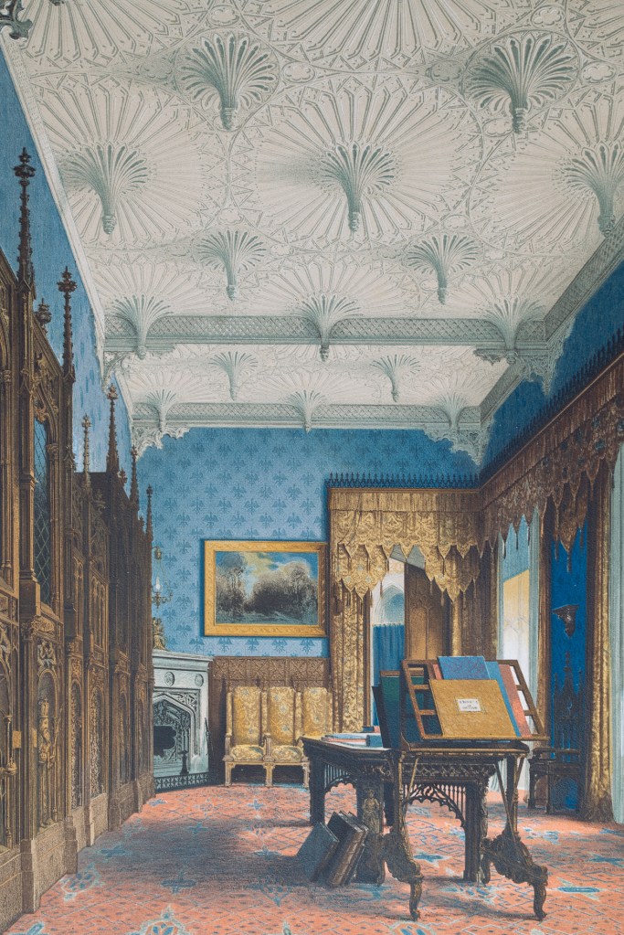 名稱:【巴伯斯貝格堡圖書室】:出自【巴伯斯貝格堡:十二幅水彩】(Schloss Babelsberg. Zwölf Aquarelle)第六張。