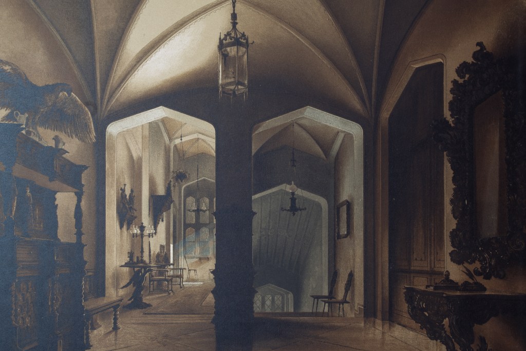 這張彩色石版,出自【巴伯斯貝格堡:十二幅水彩】圖冊,紀錄了巴伯斯貝格堡(Schloss Babelsberg)的內外景緻。這座城堡建於1833-1849年,分兩個階段完成,是當時普魯士威廉王子(Wilhelm Friedrich Ludwig, 1797-1888)的夏宮所在。1829年,威廉和奧古斯塔·卡特琳(Augusta Marie Luise Katharina, 1811-1890)成婚,當時的普魯士國王腓特烈·威廉三世(Friedrich Wilhelm III, 1770-1840)出資為二兒子在波茨坦(Potsdam)的巴伯斯貝格城區建造居所,由知名的新古典主義建築師卡爾·弗里德里希·申克爾(Karl Friedrich Schinkel, 1781-1841)負責設計,由於當時歐洲流行哥德式的復古風潮,設計遂以哥德風為主軸。在德國浪漫主義的這個時期,城堡象徵著德意志的整體,加上威廉的妻子奧古斯塔迷戀英國的哥德風格,並自行專研,在設計上和建築師申克爾多所衝突。然而,最後由於經費不足,城堡整體設計只完成了一部分。1835年10月,第一階段落成,新哥德式的落地大窗引進大量光線,可以飽覽周圍的風景,另外,也包含了做為餐廳的八角建築。